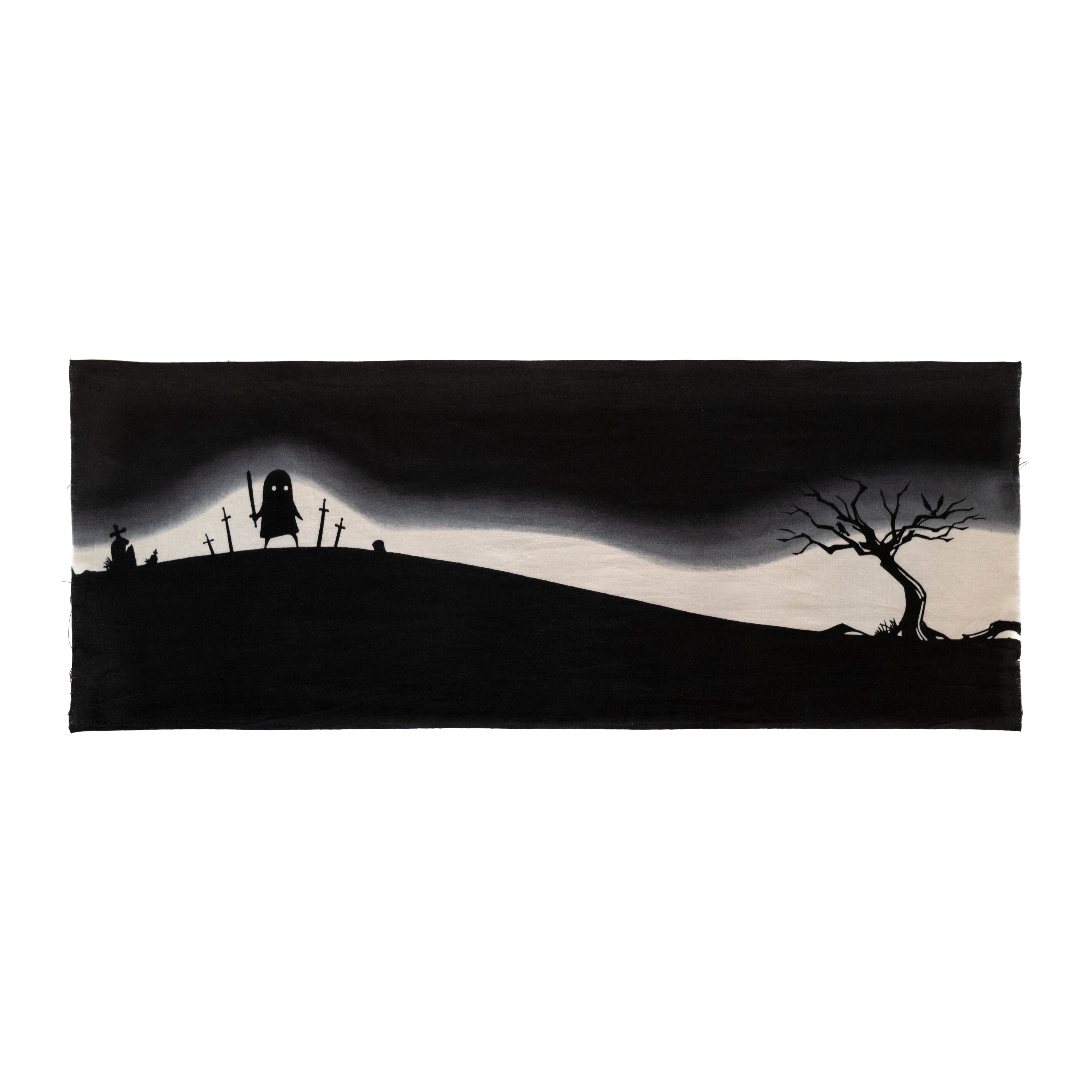 注染で浮かび上がるビジュアルは、コヤマさんによる描き下ろし。2次元コンテンツに於けるスタンダードな記号で編まれた全景は、おばけ=死・生の物語を描いており、白と黒による対比とおぼろげなグラデーションがイメージを補完しています。